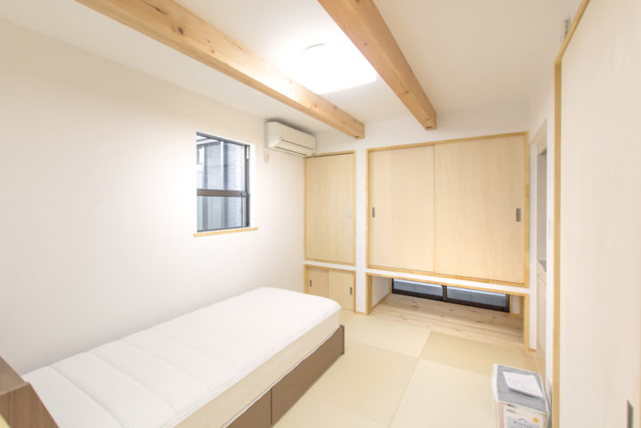壁一面の収納。地窓を設置することで通風もばっちりです