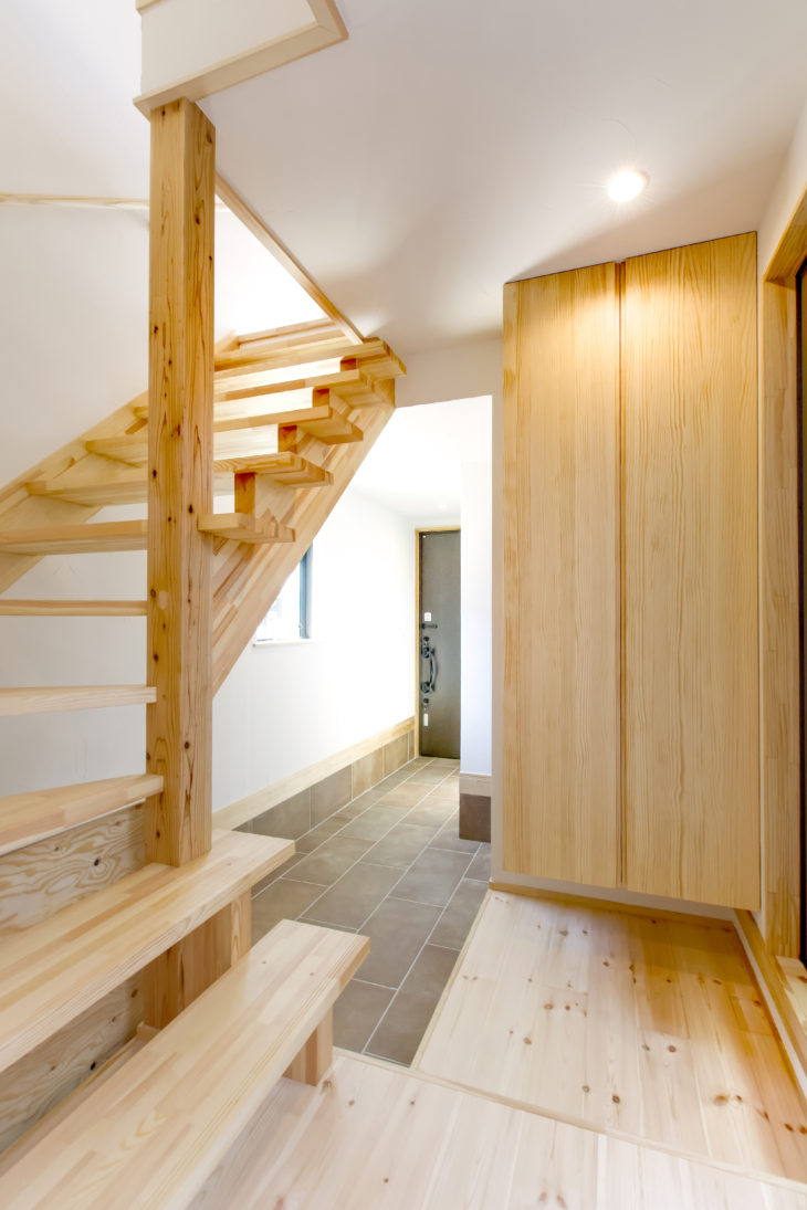 限られたスペースの玄関ホールもオープン階段にすることで圧迫感を軽減出来ました