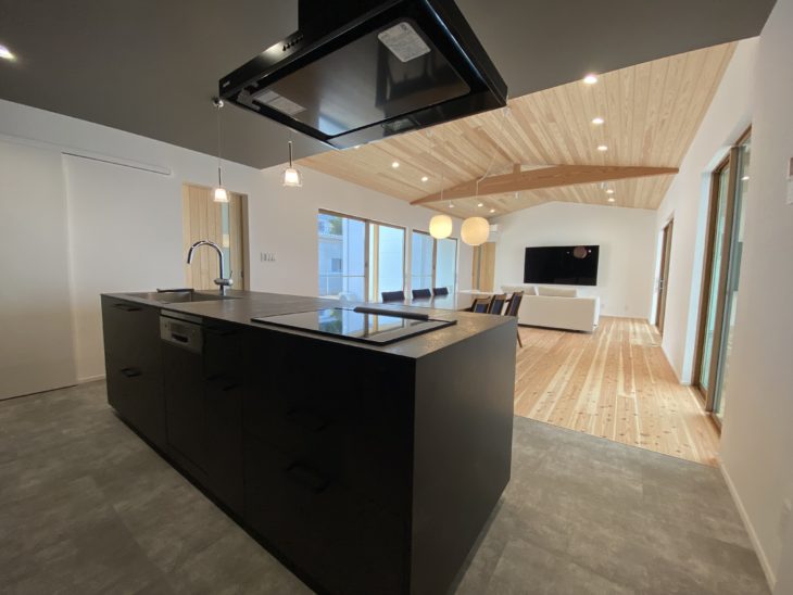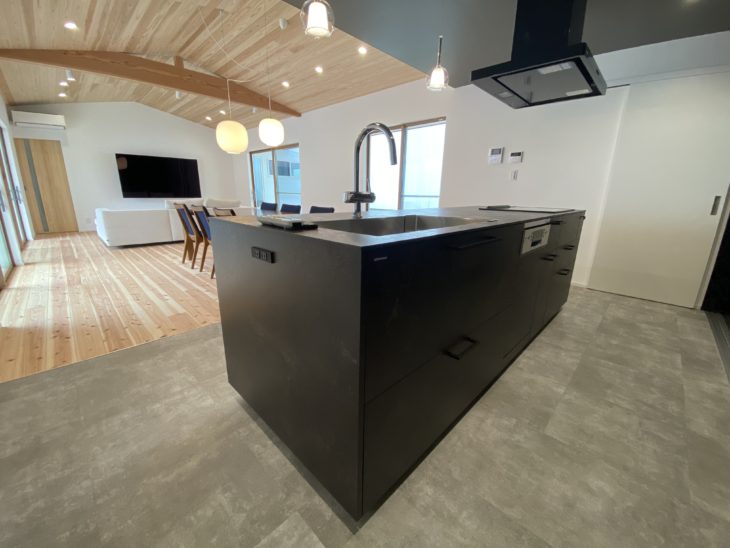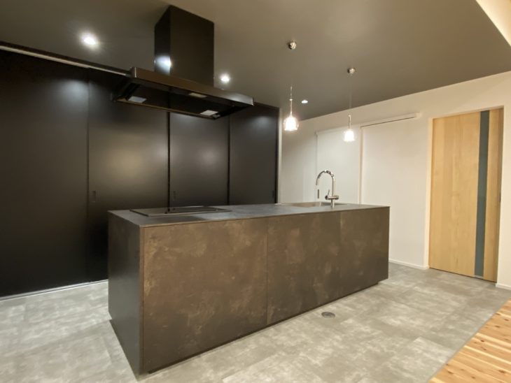 キッチンハウスのカッコいいグレーのキッチン。背面は建具で全て隠すことが出来るのでとてもスッキリです。