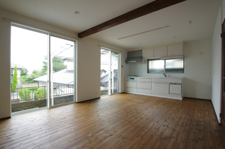 パインの無垢フローリングに自然塗料で塗装しています。 LDKの壁を取り一つの大きな部屋になった事で家族みんなで すごせるリビングになりました。